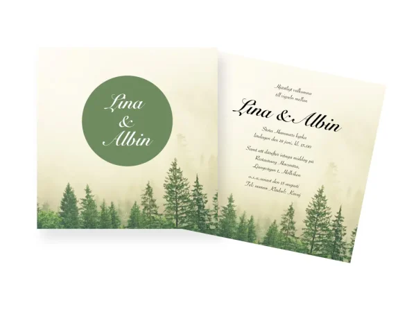 Inbjudningskort till Bröllop Mall Skog. Trycks på ett matt och tjockt papper med hög kvalitet. Bröllopsinbjudan är dubbelsidigt.